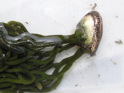 【左】レモンカノコガイを観察しました。アジモを食べるとありました。アジモ→アマモ