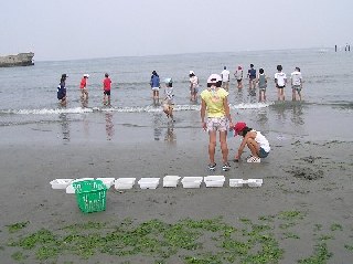西春町は海から離れている関係か、子供たちは海に来たのがうれしいのか、随分わくわくしていました。海の中に入り遊びたい気持ちがありました。少し我慢をしていただき、海辺の生き物の観察をしました。砂浜では砂の中に隠れている生き物を掘り出したり、流れ着いた生き物を集めました。磯では潮だまりや岩陰からカニさんや魚などを採集しました。