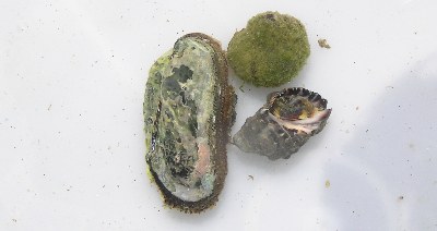 【右】左カリガネエガイ、右上スガイ、右下イボニシです。イボニシは肉食です。