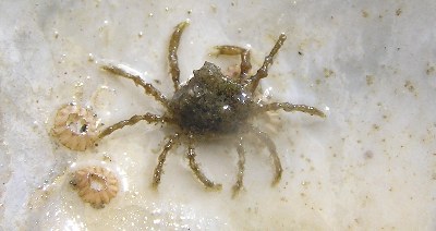 【右】イソクズガニで背中に海藻などをつけてカモフラージュをします。