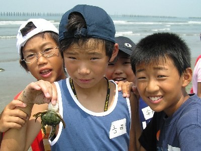 【左】一生懸命、砂の中に住む生き物を探しています。