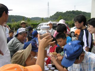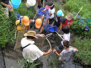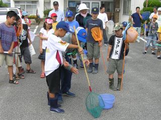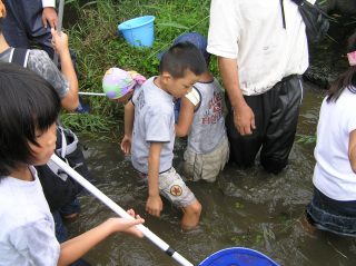 先生方の引率で、何校もの小学生のみんなが参加してくれたので、いつになくにぎやかな観察会でした。参加者の多さのために、さながら芋洗いの感じもありましたが、魚たちに逃げるすきも与えず、みんな大はしゃぎで魚などを捕まえていました。大勢で頑張ったおかげか、カワムツやテナガエビといったいつもの生き物たち以外に、今まで見つけていなかったナマズやタイコウチも発見できました。