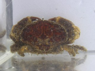 【右】イソガニ。オスはハサミの付け根にはやわらかい袋がついます。