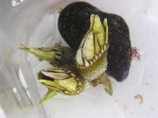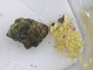 【左】イボニシと卵です。船底塗料による環境ホルモンで生殖器がオス化しているそうです。