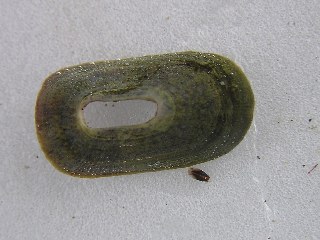 【右】ヒラスカシガイの貝殻。真ん中の穴は生き物により空けられたものではありません。穴が開いた貝なのです。