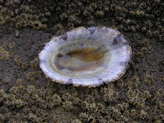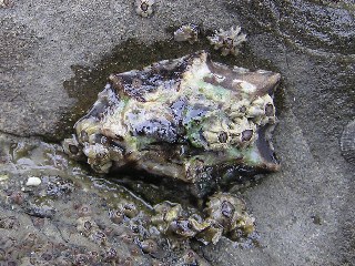 【左】ウノアシという傘貝の仲間です。表面にイワフジツボが着生しています。