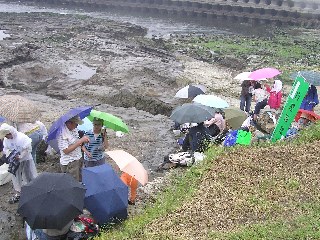 【中】名古屋から旗を立ててやってきた皆さん。海が大好きで少雨の中、昼食です。