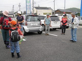 あいにく集合時間近くになって小雨が落ち始め、その後降ったり止んだりの天気の中での観察会でした。しかしそんな天気にもめげず、一般参加の家族(4組13名)のみなさんもやる気満々で自然観察に取り組んでくれました。