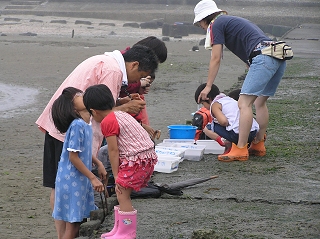 その後桟橋を伝って干潟に降り、間近に生き物たちを観察しました。中には指を挟まれて泣き出す子もいましたが、子どもたちはカニを捕まえるのに必死になっていました。
