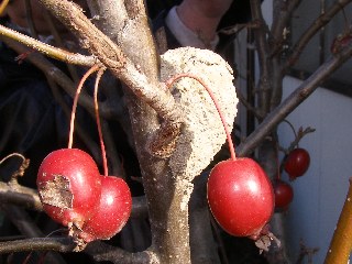 【左】ハゼノキの紅葉と果実 【右】ヒメリンゴの木にスズバチが巣を作った。
