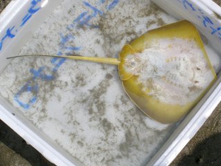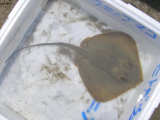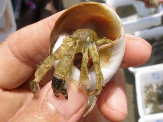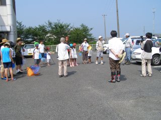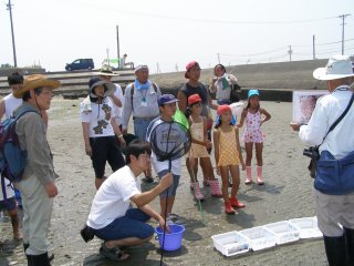 河口付近の観察を終えてから、奥田海岸に移動しました。到着後最初に指導員の森田氏から危険な生物の説明を受けてから、銘々がタモやバケツなどを持って、生物採集に熱中しました。海岸は遠浅で、所々に潮だまりが出来ていましたが、その中には縦歩きもできるカニのマメコブシガニがたくさんいました。このカニをたくさん捕まえている家族もあれば、追い込み漁の如く協力して魚を捕まることに闘志を燃やす家族、突堤脇で岩場の生物の観察に興味津々な家族など、それぞれが思い思いに1時間ほどの観察を楽しみました。この海岸では、アサリ、アカエイ、アミメキンセンガニなどの砂地を住みかとするものや、突堤付近で採取された、イボニシ、イソガニ、タマキビ、ヒザラガイなどの岩場を住みかにするものも観察することができました。