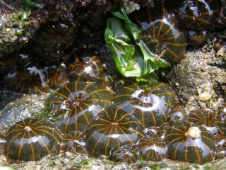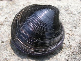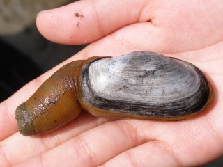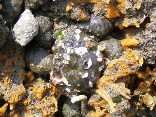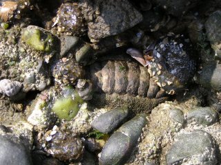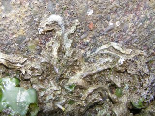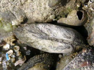 【左】コンクリートの割れ目に住むカリガネエガイ