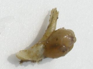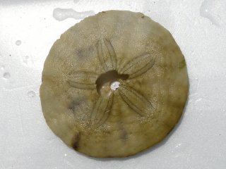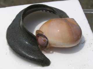 【右】ツメタガイと卵塊。ツメタガイがシオフキに空けた穴。