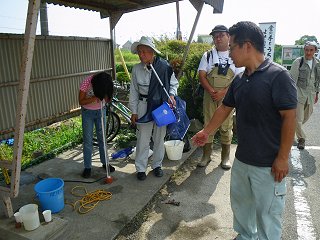 観察と並行して、美浜町職員の方(2名)の指導の下、愛知県の「水循環再生指標調査マニュアル」に沿った調査を行いました。透視度、水温等の観測、水質、水量、水辺の状況の観察などを行い、各項目について評点をつけるなど、参加者皆で調査個票の記入を行いました。