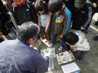 【左】熱心に化石の観察をしています。 【右】ウニの化石