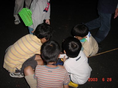 明るい中、発電機を使って水銀灯を点灯させました。人がたくさん集まってきました。しかし、いつまでも白々明るいので虫はあまり集まりません。水銀灯を点灯させたまま懐中電灯を持参して、森の中の生き物ウオッチングすることにしました。森の中で、観察できたものを一部紹介します。