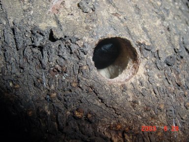 【右】クマバチの巣穴 クマバチの巣穴を見にたくさんの人が集まってきました。