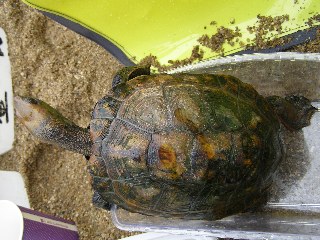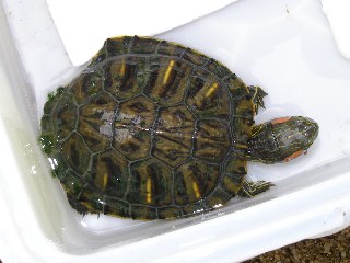 【右】アメリカ原産のアカミミガメといわれているミシシッピーアカミミガメです。夜店で売られているミドリガメはこれです。