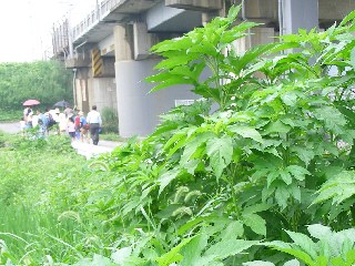【中】新幹線の下を進みました。右の大きな草はオオブタクサで、アレルギーを起こす有害雑草です。