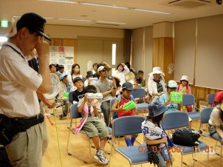 【左】出発前、大勢の子供さん達を前に観察ポイントと注意点を説明しています。