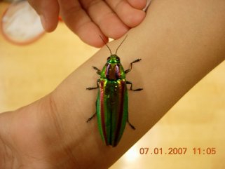 【中】古代、馬具や衣服に飾られたといわれる金緑色の綺麗な羽根をもったタマムシです。