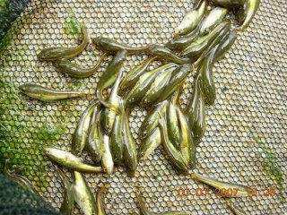 【左】一見、ネコヤナギの濡れた花穂と紛うほど沢山のライギョの稚魚が平戸池にいました。