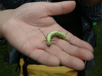 【左】何でも聞きます 【左】見たことのない毛虫(青虫)にみんなが注目。“イボタガ”の幼虫