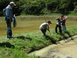 【左】いちょうのめばな。花びらのない原始的な花。おすの木のおばなの花粉が風でとばされてきて付くと、秋にはギンナンがなる。   【右】カエル、ドジョウ、ヤゴ、ざりがにをつかまえているところです。
