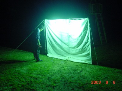 【左】白布の幕に水銀灯を吊り下げて光を求める虫を集めて観察をします。時刻により虫の種類も変わります。