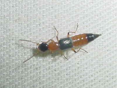 【右】アオバアリガタハネカクシです。成虫・幼虫ともに小さな昆虫など動物食。体液に毒があって、皮フに付くと皮フ炎をおこす。まちがって目にはいると失明することもあるという。
