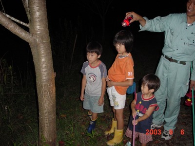 【右】虫が集まってくるまでの間、ナイトハイクをしました。アブラゼミが見つかりました。
