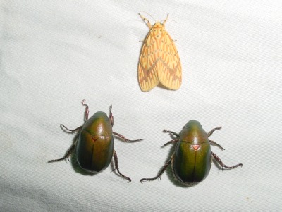 【左】スジベニコケガとアオドウガネが規則よく三角に並んでいたので写しました。