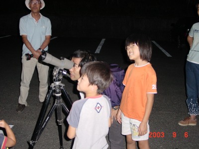 【右】お別れに火星と月を見ました。月のクレータを望遠鏡で初めて見て感激していました。