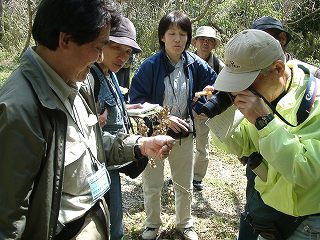 青池に向かうとゴヨウアケビ、ミツバアケビともに花が咲き、30センチ以上のツクシがあり、あたり一面の大きなツクシを見ました。その時、足元から突然キジが飛び立ち、皆がびっくりしました。地面でアマガエル、ツチイナゴ(成虫で越冬)を。水田横の小さな水路ではヨシ、イ、アゼスゲを観察しました。(中井三・記)