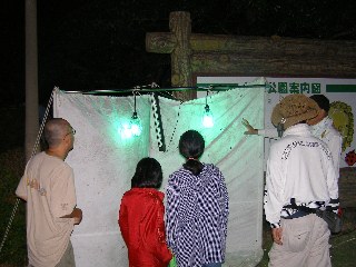今まで公園の入口から入り、芝生広場の手前の遊具の前で水銀灯を設置していました。今年は手抜きをして、公園入口の案内看板前で行うことにしました。駐車場に近いので、虫集めの仕掛けは順調に準備することができました。ところが、発電機の町誌が悪く、直ぐに停止をしてしまい電灯を点すことができませんでした。何度も工夫してやっとエンジンが回りだしましたが電圧が上がりません。よって、誘蛾灯は点りませんでした。トラブル続きの中、虫の音を聞きに散策に出かけました。