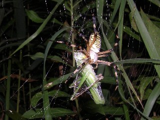 【右】獲物に有りついたナガコガネグモ。