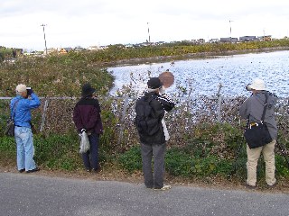 集合場所の常滑市鬼崎公民館は公民館まつりで混雑をしていました。いままで公民館の駐車場を利用できましたが少し離れたところに誘導されました。今まで公民館祭りは2月に行なわれていたみたいですが今年から12月に変わったみたいです。今回会員以外で参加された方に刈谷市から見えた方がいました。聞いたところ知多自然観察会のホームページを見て参加されたそうです。集合場所の公民館に集まり玉越池を目指しました。玉越池までは公民館から約1キロメートルあり、途中に神明社という神社があります。神社で一時冬鳥の観察をしてから玉越池に向かいました。今年も例年通りカモ類を観察することが出来ました。