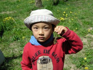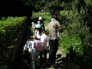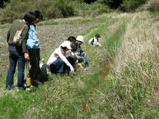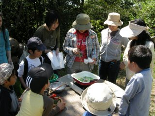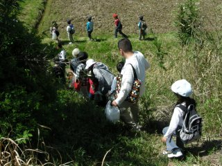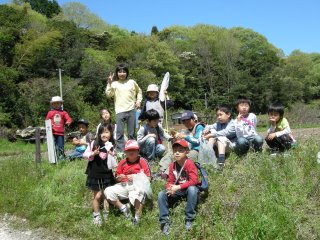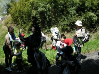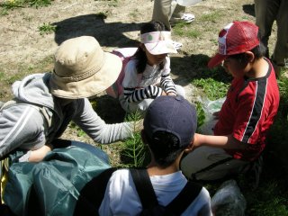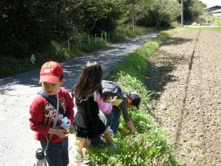 今回、常滑市在住の方で、知多市の文化センターでの行事に参加していた人の声賭けで多数の方の参加がありました。9時30分に開始のあいさつの後、試食の野草を集めるようお願いをし、保険の注意事項の説明をして春を探しに歩き始めました。抜けるような青空と初夏のような風、少し熱いぐらいの陽気です。子供たちはチョウ、てんとう虫をみつけておおはしゃぎ、試食用のものはもっぱら大人の役目でした。途中でメダカ、ザリガニ、アマガエル、へびに出会いました。