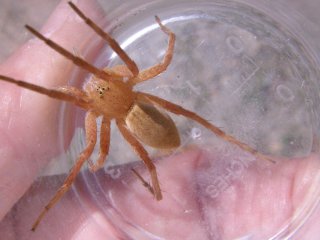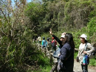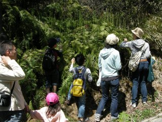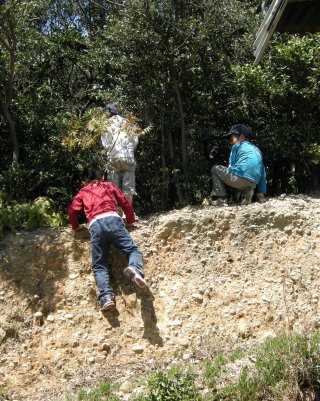 【左】木陰で野草料理を食べ昼食  【右】イオウイロハシリグモ。子供たちは手で触りました。