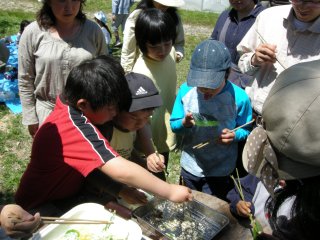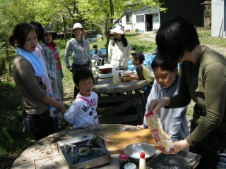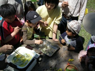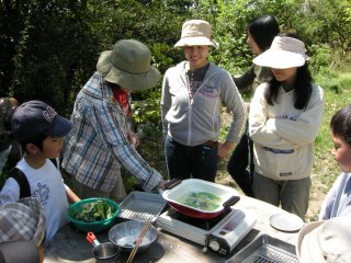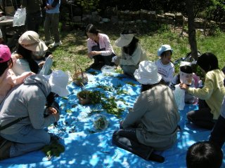 【左】食べられる野草を摘んでいます。  【右】子供たちもテンプラのお手伝い