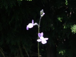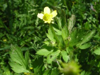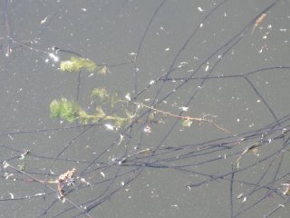 【右】青池に生えていた有害外来植物のフサジュンサイの芽出し
