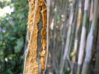 【左】キノコの仲間で、担子菌類サビキン目のメダケ赤衣病菌です。
