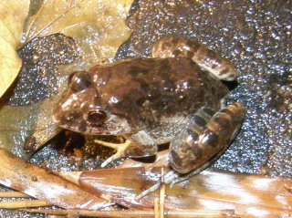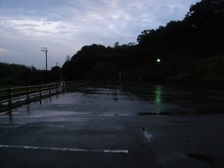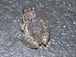 当初、発電機を設置し、水銀灯を点して明かりに集まる虫を観察する予定でしたが小雨が降っていたため取り止め、懐中電灯持参でナイトハイクを行いました。雨も上がり、虫たちが鳴き始めました。特に、外来性のアオマツムシの音が大きく、他の虫の音をかき消すくらいでした。それでも何種類かの虫の音を確認することが出来ました。地面が濡れた状態でしたので、雨が大好きな生き物たちが道路にたくさん現れていました。(記・降幡)