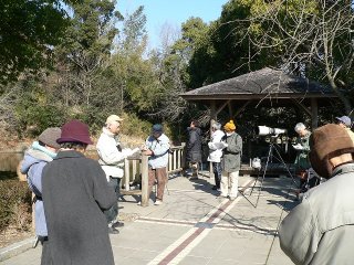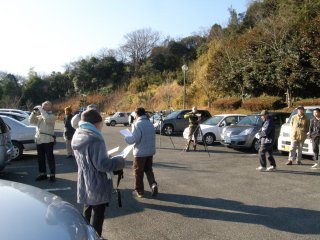 「常滑野鳥の会ミサゴ」の例会に合わせて開催し、集合時間を9時にしました。9時に集合場所へ行った時には、「ミサゴ」の会員さんはすでに駐車場で観察中でした。9時になり「ミサゴ」の世話人さんから12月の観察会(例会)の「鳥見録」を頂きました。「鳥見録」=コメント、出逢った鳥33種名、マヒワ カワセミの写真が掲載。 「ミサゴ」の方に続き、挨拶自己紹介をし、公園の東側の小路に沿って観察をはじめた。観察路は公園と休耕田に挟まれた小路でハンノキが多くあり、少し上り坂でした。 この日はとても冷たく休耕田の水溜りには、7ミリ程の氷が張っていました。空は真っ青、風も無く、観察にはとても良い日でした。「ミサゴ」の方々は倍率の高い望遠鏡を持参の方が多く、モズ、ジョウビタキ♂♀と大きな画面で見ることが出来、鳥たちの目の動きが見えるのです。ハンノキ林の中ではマヒワの群れ、ジョウビタキも楽しそう。 上空は抜けるような青空で、オオタカが2羽輪を描き、チョチョチョと啼いていた。このように番で行動するのはこの時期だけと聞き、ちょっと感動!岐路の時、ノスリが上昇気流に乗るように舞い上がって行くのが見えました。駐車場近くの東屋に戻り、鳥合わせを行い(22種〕11時40分解散しました。(記・中井三)