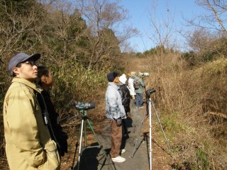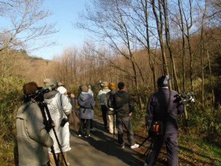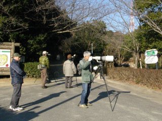 【左】さんさん集まる中、来た人から早速観察 【右】ツグミも集まってきました。