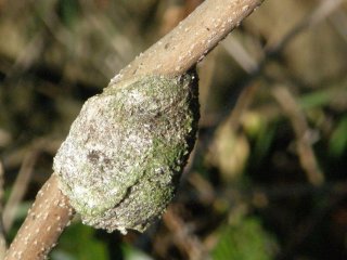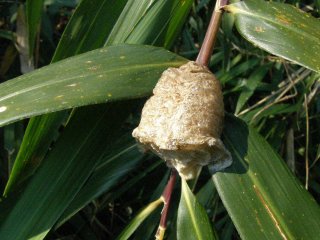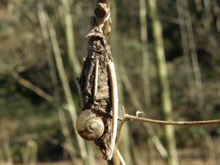 【左】ミノガの踊室にイセノナミマイマイが休んでいました。