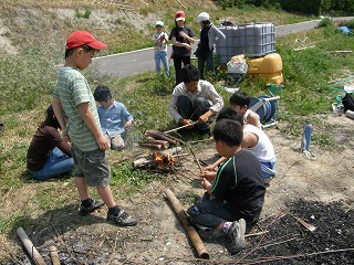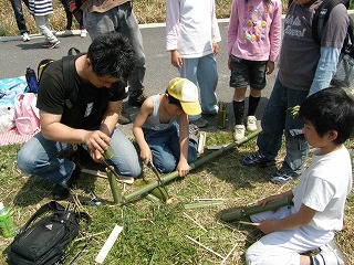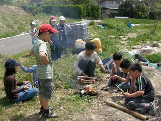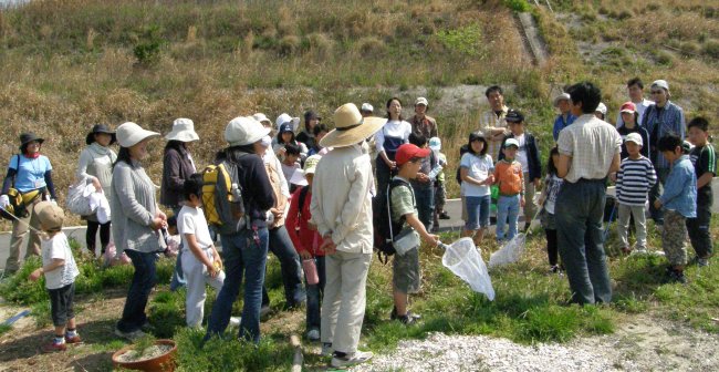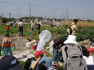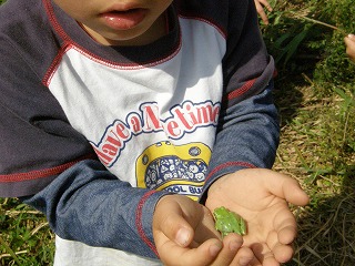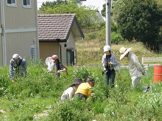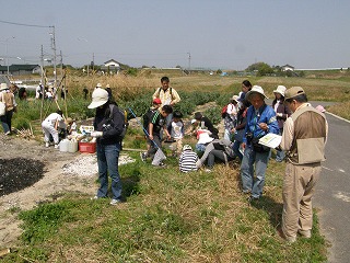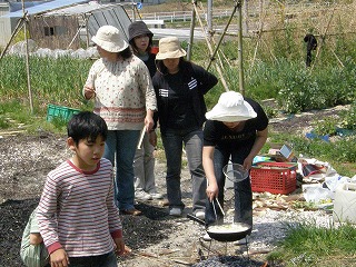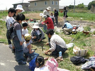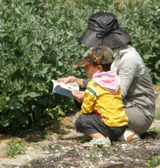 今まで計画をしたことが無いテ−マでしたが予想以上の家族が集まりました。会場は野菜を無農薬有機栽培をしている常滑市大谷の「M-easy」常滑ファームにお願いし行いました。一般に見かける畑と違い野菜とは他の雑草が同居していました。畑を管理している会員の竹内氏から茂っている雑草を取らないようお願いがありました。また、害虫も益虫も殺さないよう観察するようお願いがありました。M-easy発行の「やさいにあつまるむしずかん」を安く譲ってもらい楽しい観察をしました。  昼は野草のテンプラ、おひたし、焼タケノコを作って旬の味覚を楽しみました。(記・降幡)