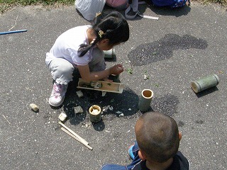 【左】竹でコップを製作  【右】おひたしを作っています。