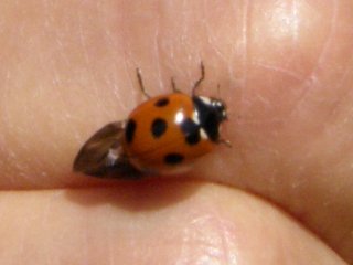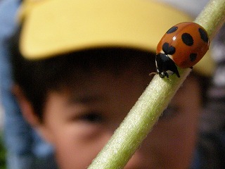 【左】野菜が雑草が同居している畑  【右】アブラムシを食べるテントウムシ