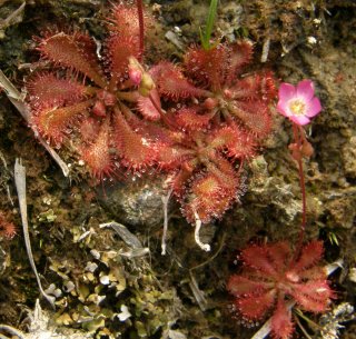 【左】湿り気の多いところで見られるミヤコイバラ  【右】モウセンゴケと花